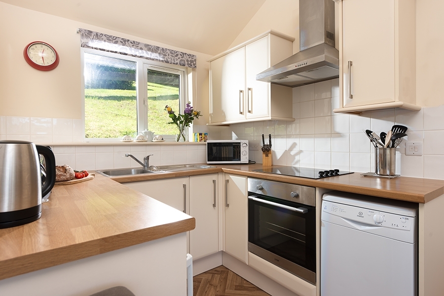Cosy wooden clad holiday bungalows with modern interiors and beautiful, scenic views. A fully equipped kitchen with a microwave to heat up a quick meal or an oven and hob for a more ambitious family dinner makes catering easy, whilst clean up is made even easier by the inclusion of a dishwasher. Choose to enjoy your meal at the family dinner table or open up the French doors and eat outside on your private decking area for an al fresco dining experience.