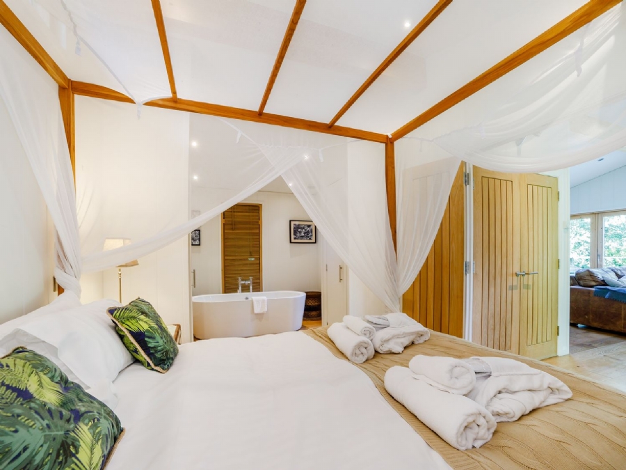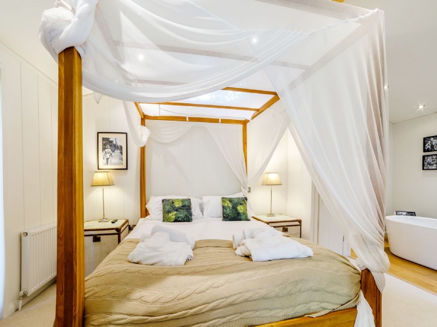 Catch that well-earned rest in the lavish double bedroom, featuring a classy four-poster bed and a freestanding bath for that extra indulgent touch. Make the most of the glistening en-suite facilities which conclude the interior in elegant style.
