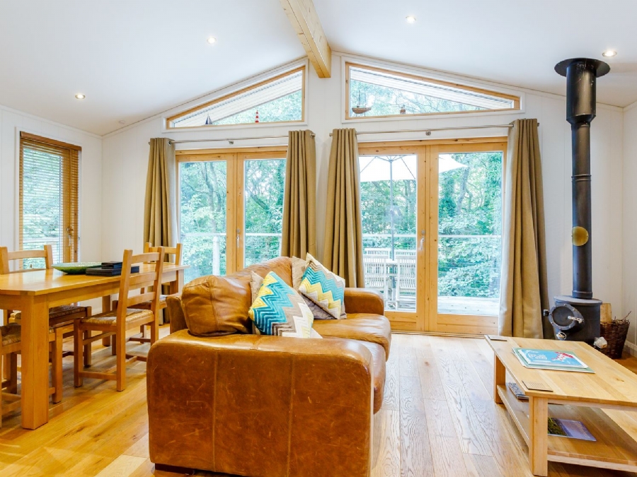 The cosy lodge opens out on to a secluded decked terrace, with a sunken hot tub, and the floor to ceiling windows carry the woodland idyll inside as well as inviting light in through the open plan living, dining, and kitchen area and the bedrooms of the lodge.
