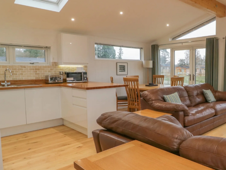This stylish lodge is set within the fantastic Cornish countryside, perched on the side of a lake with stunning views of the surrounding fields, perfect for enjoying while relaxing in the hot tub on the wraparound terrace. The open-plan living area has a high spec modern kitchen, dining area with seating for six and two large comfortable leather sofas.