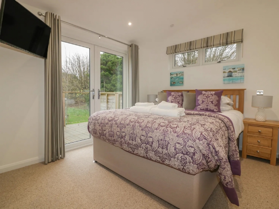 The lounge area sits off to the side with cosy sofas facing your French doors, so you can make the most of our commanding views. A compact dining set and TV complete the picture and central heating is available to keep you all warm and snug, whatever our weather throws down!